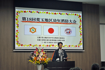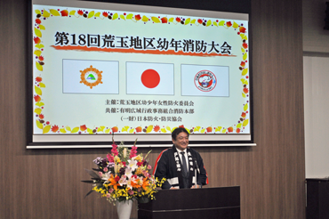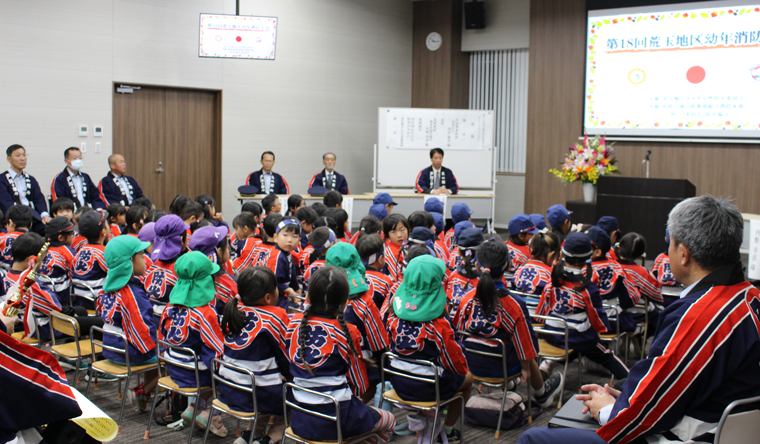 | 荒玉地区幼少年女性防火委員会(事務局:消防本部予防課)では、2年に一度、各クラブが一堂に会し、消防とのふれあいを通して、防火防災思想の高揚と幼年消防クラブの活性化を図るため「荒玉地区幼年消防大会」を開催しております。 今年で18回を数える本大会は、集合形式の式典(オープニングセレモニー)を玉名市築地の消防本部庁舎にて、大会初日の令和7年10月29日(水)に開催しました。翌30日(木)からは、約1か月半の期間で、クラブ単位での個別体験学習を実施してまいります。 |