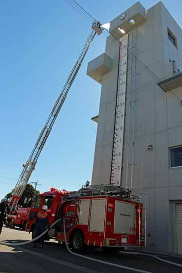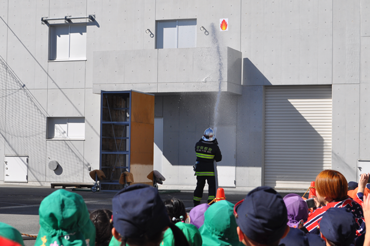 | 後半は、屋外の訓練棟付近にて、消防職員による消防活動や救助技術の訓練を披露し、参加したクラブ員たちからは、大きな歓声が上がっていました。 | |